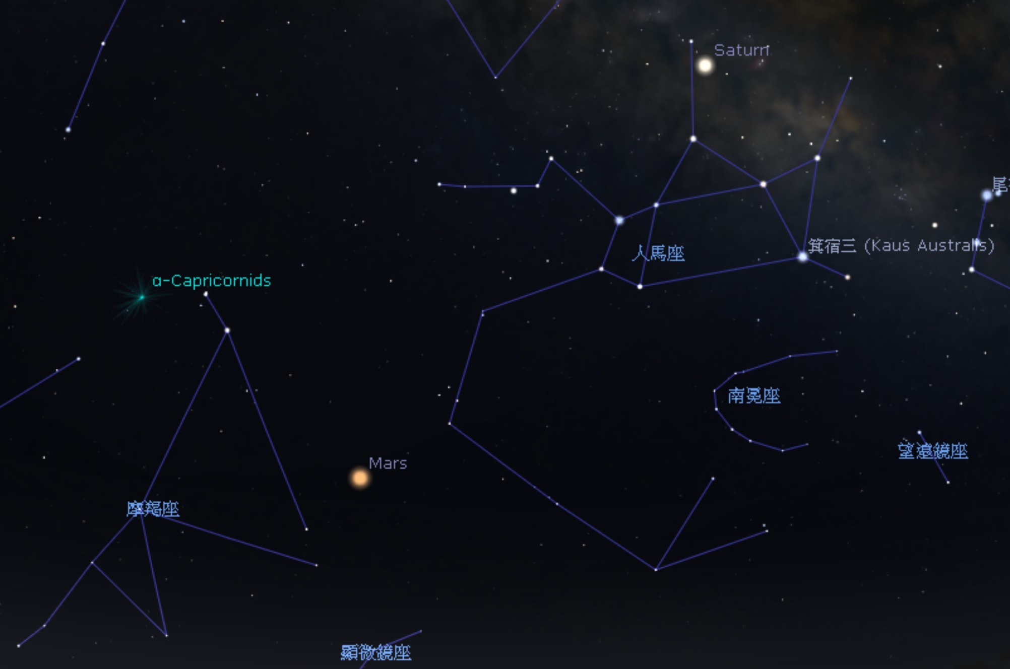 2018年7月30日晚上8點東南方,這個時間月亮尚未出現,火星位在魔羯座與人馬座間。