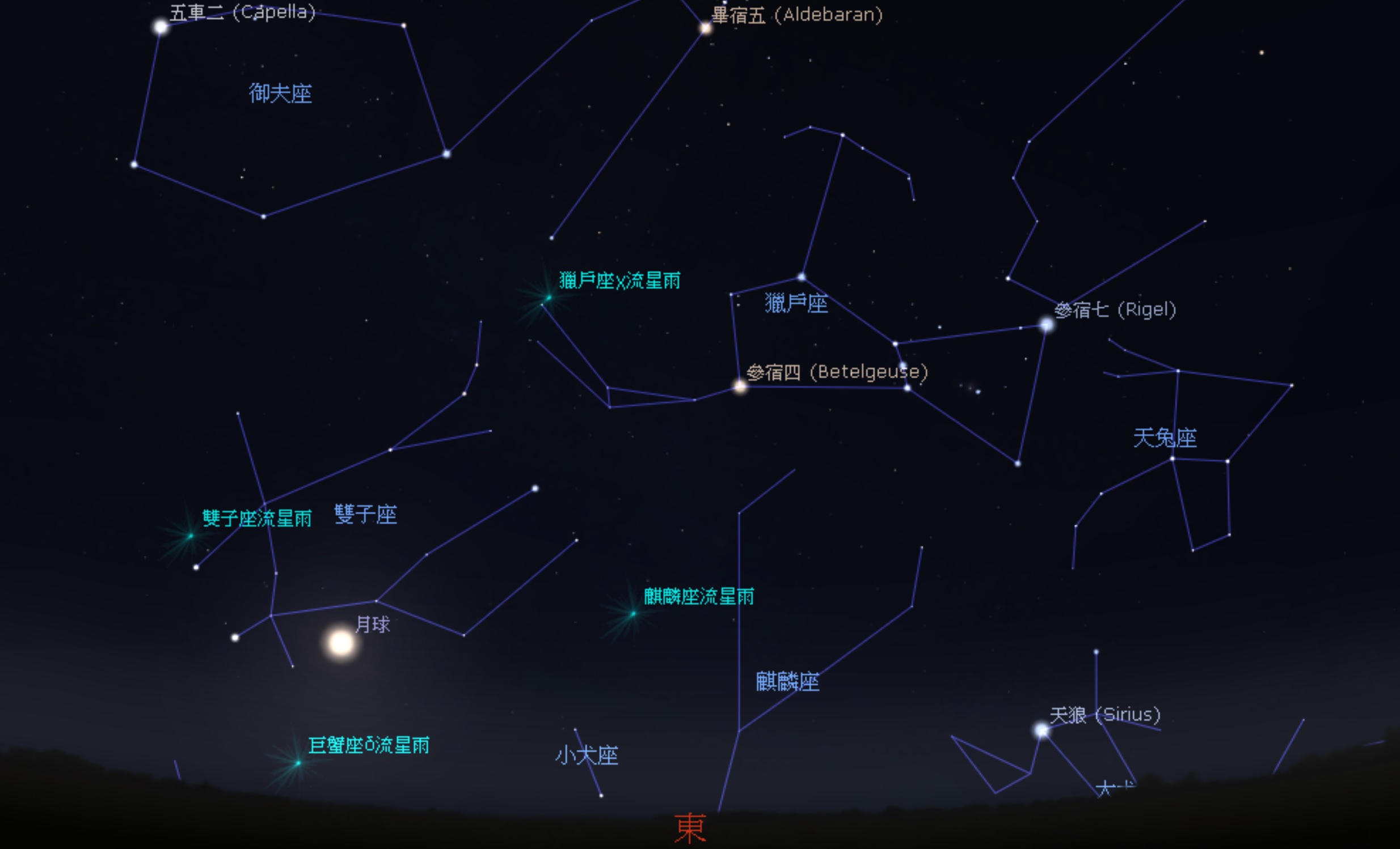 12月初的日沒後,可見金牛座正在東方逐漸升起,再稍晚,隨著天蠍座完全西沉後,永不相見的獵戶座也正自東方升起,為閃亮的冬季星空展開了序幕。年度3大流星雨中的雙子座流星雨,由於流星特性明亮,移速中等,適合各種觀測方式,在冬季夜空中,一直是天文愛好者的主要觀察目標,今年極大期預估將發生在12月15日,但月亮這期間正好雙子座附近,導致觀測條件不佳。