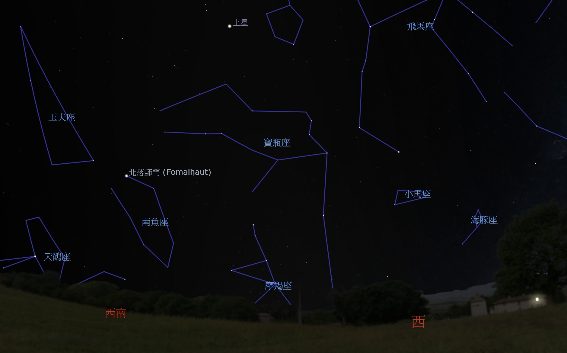 | 2025年11月5日晚間11點西南方,土星位於雙魚座及寶瓶座間,北落師門在地平線附近 |