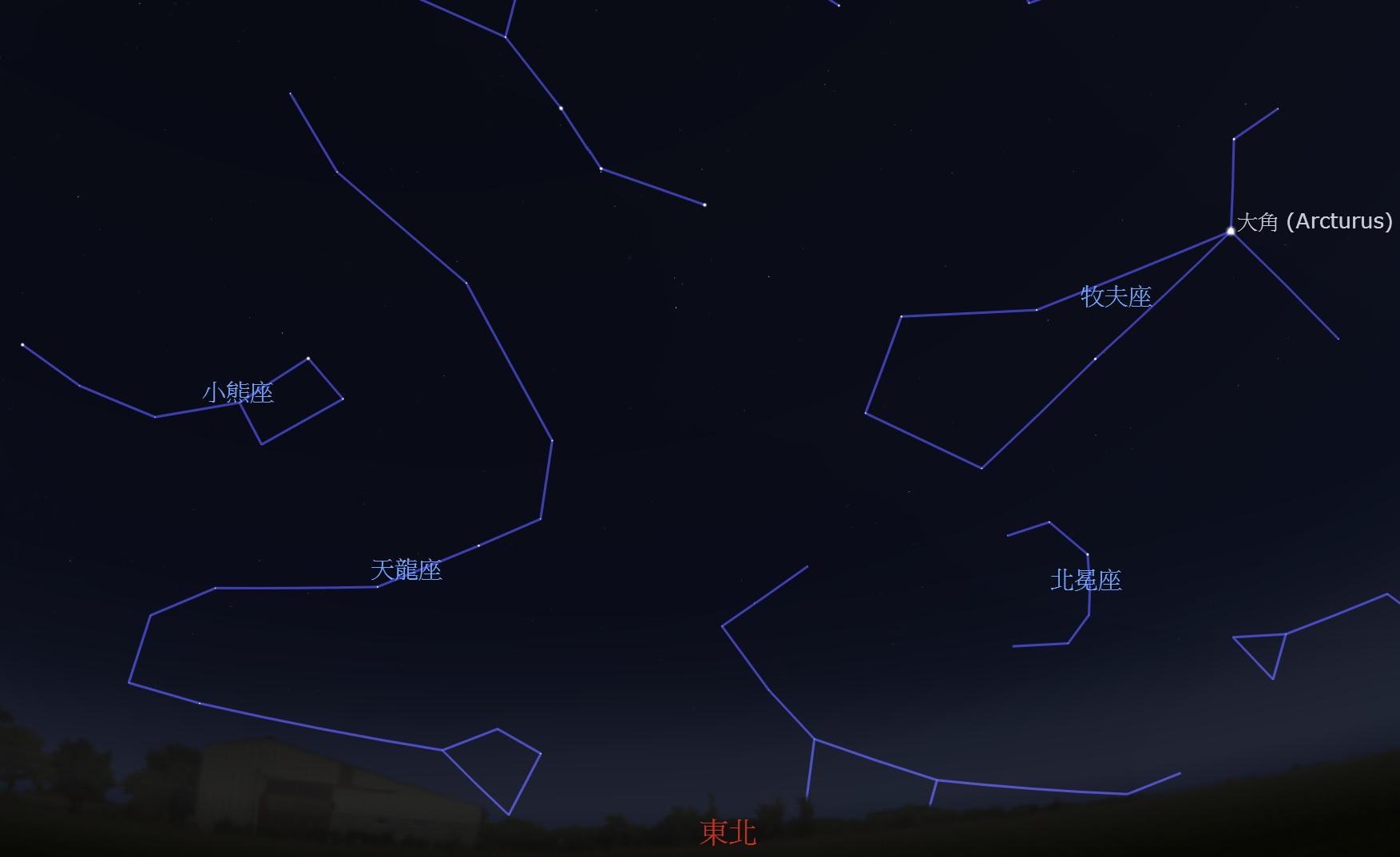 | 2026年1月4日晚間9點東北方,象限儀座流星雨輻射點位於天龍座與牧夫座中間 |