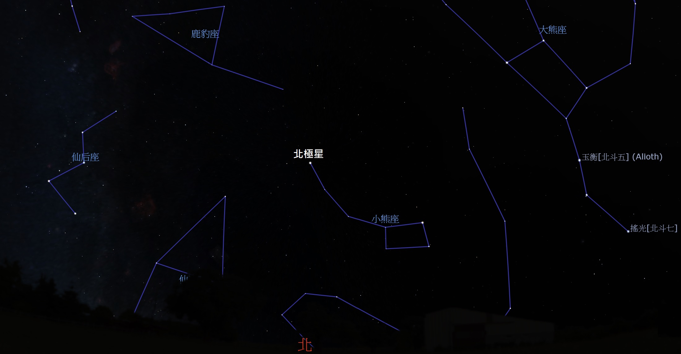 2026年2月5日晚間10點北方,左邊W型為仙后座,右邊為北斗七星(大熊座),中間(正北方)為北極星