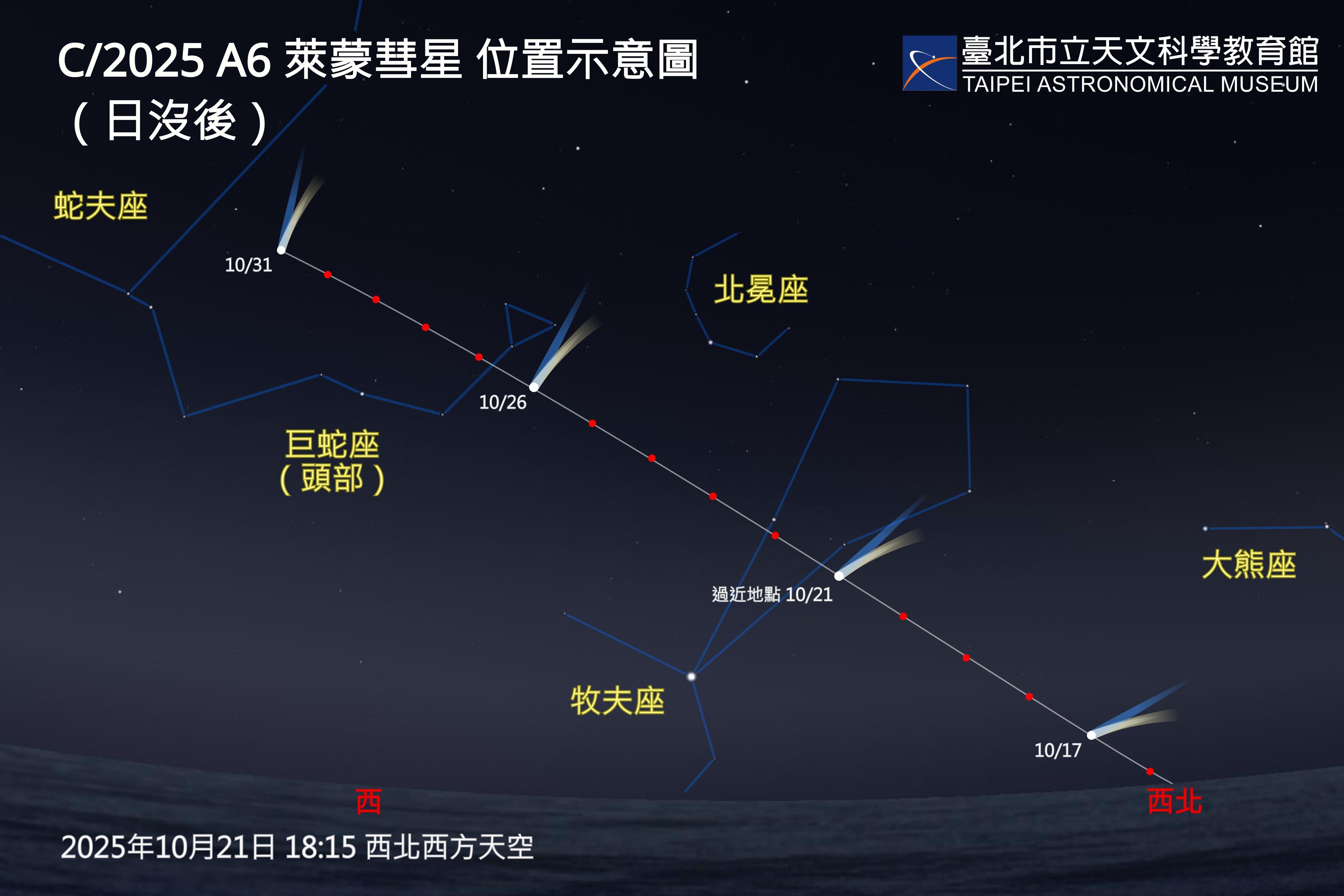 於10/18拍攝的Swan彗星,此時它已在遠離太陽系,故不見彗尾,但周遭的暈光,仍顯現出因太陽照射彗星,激發其中雙原子碳及一氧化碳離子,所呈現的藍綠色。於10/25拍攝的Lemmon彗星,此時因達到最高亮度,彗核明亮彗髮明顯,但由於市區低仰角視相度(seeing)較差,無法看出離子尾。